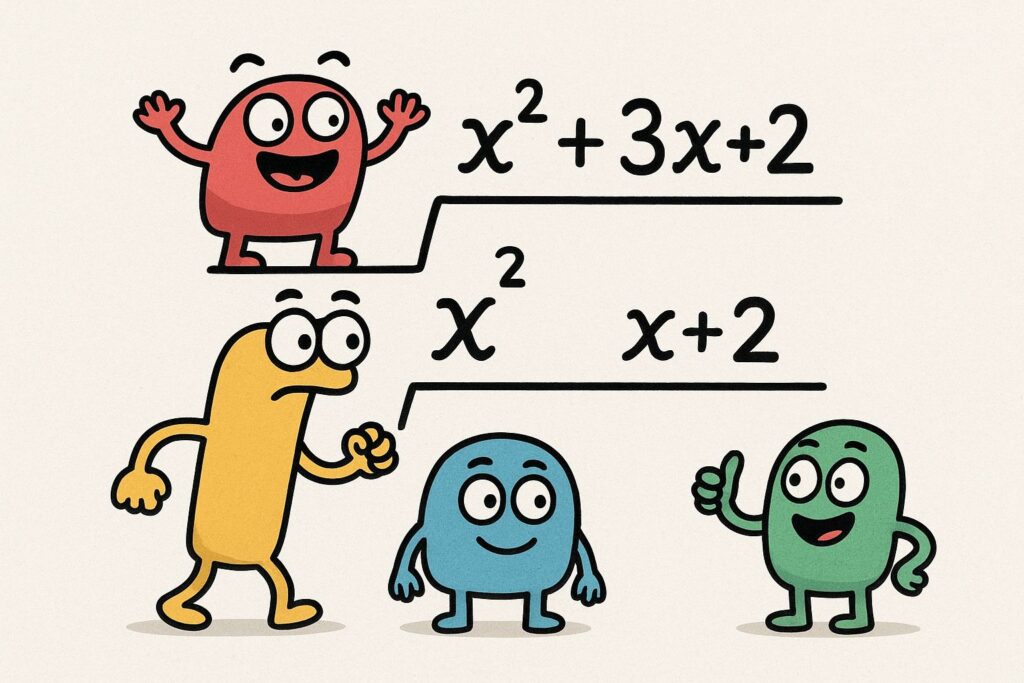 Der Term vor dem Teiler ist der Dividend, der Term danach der Divisor. Das Ganze ist der Dividend. Das alles kennt man schon aus der Grundschule, als man dort Divisionen durchführen musste. Das Gleiche macht man nun aber mit Termen (Polynomen)!
