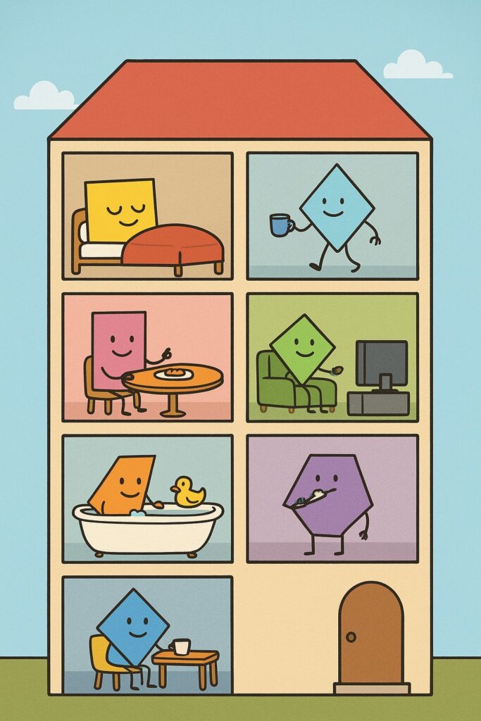 Im Haus der Vierecke befinden sich alle möglichen Vierecke – also alle Vierecksarten. Darüber hinaus wird im Haus der Vierecke ersichtlich, welche besonderen Eigenschaften diese haben und wie die Beziehungen zwischen diesen sind.