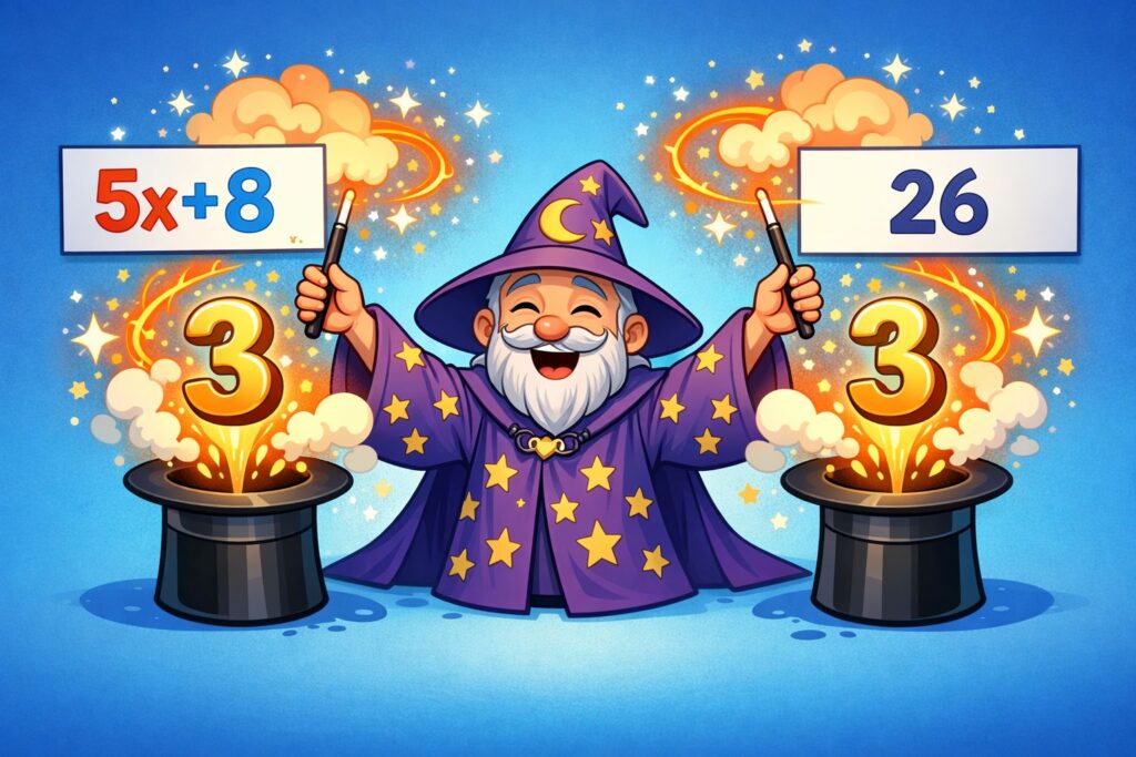 Bei der Ursprungsgleichung wurde rechts und links der Gleichung „– 8“ abgezogen. Hierdurch ergab sich die lineare Gleichung „10x = 30“. Darauf wurde bei dieser Gleichung rechts und links des Gleichheitszeichens die Division „: 10“ durchgeführt.