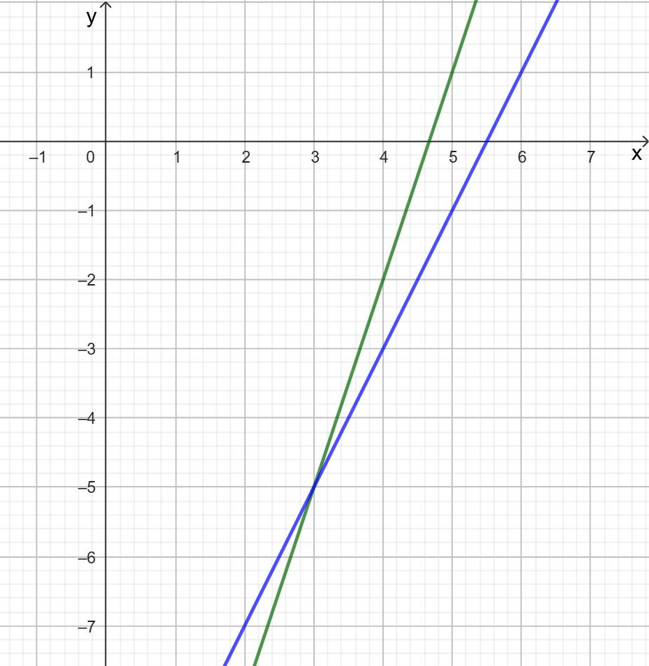 Der Schnittpunkt des linearen Gleichungssystems liegt hier bei S ((3|–5). Auch hier bestätigt der Schnittpunkt die Lösung L = {(3|–5)}.