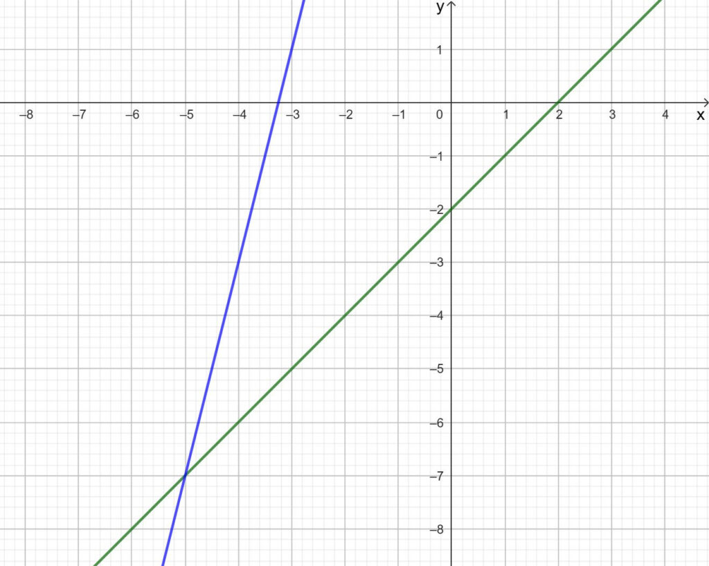 Die grafische Lösung ergibt den Schnittpunkt S (–5|–7) und bestätigt somit die Lösung L = {(–5|–7)}.