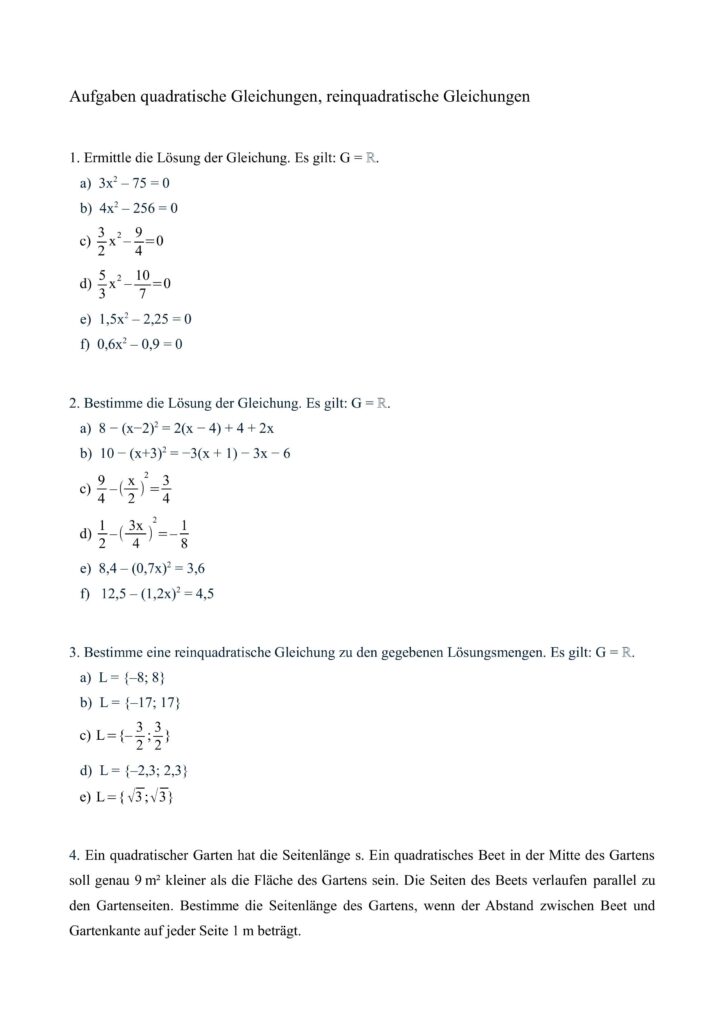 1. Bestimme die Lösungsmenge der reinquadratischen Gleichung.