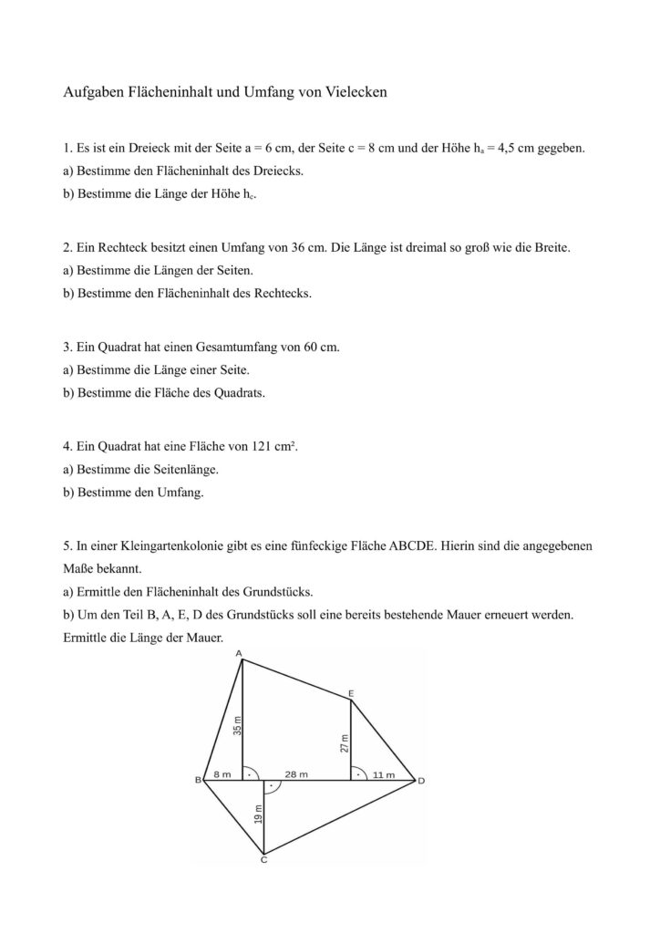 Aufgaben zur Berechnung des Umfangs und des Flächeninhalts von Vielecken